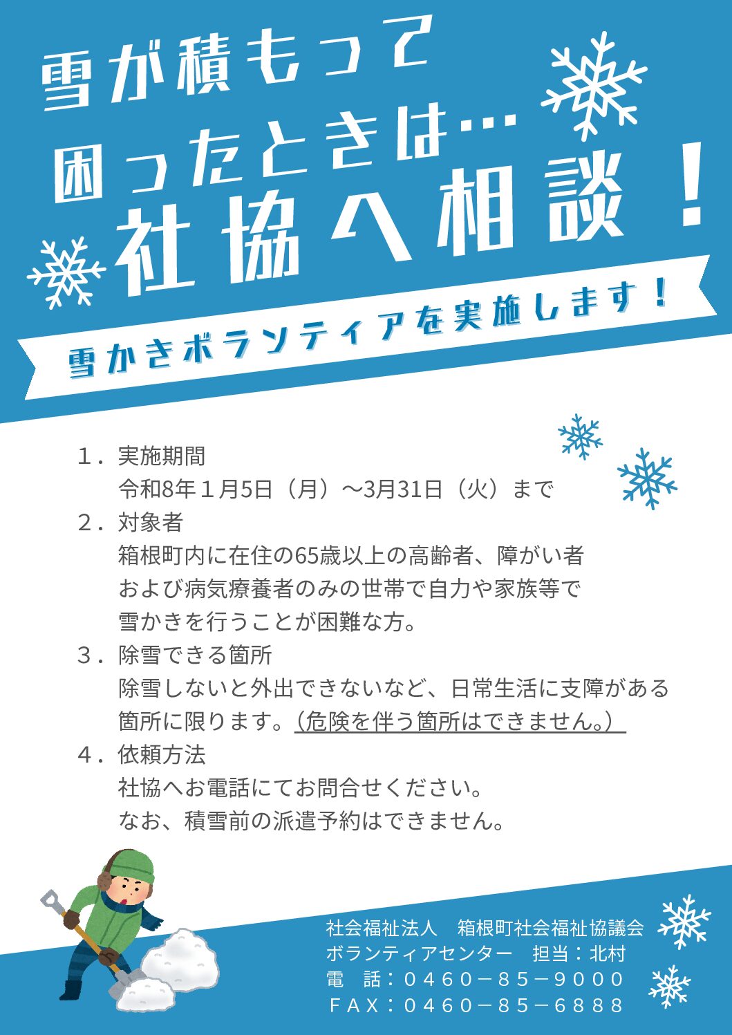 箱根町社会福祉協議会では、令和8年1月5日~3月末日まで 「雪かきボラ...